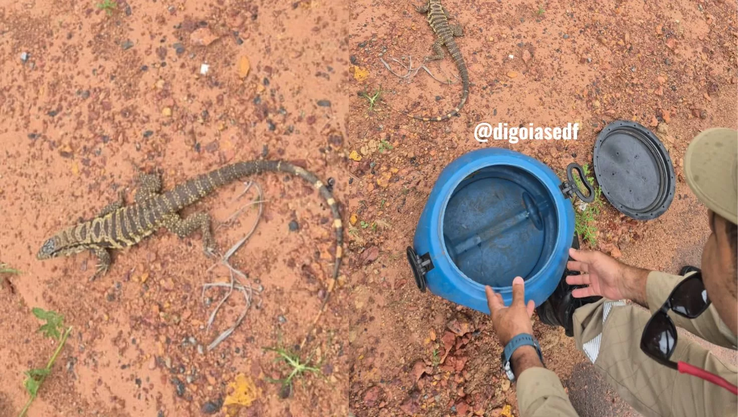 Bombeiros do 19º BBM capturam um teiú encontrado em estabelecimento comercial em Formosa e realizam a soltura segura do animal em área de vegetação.