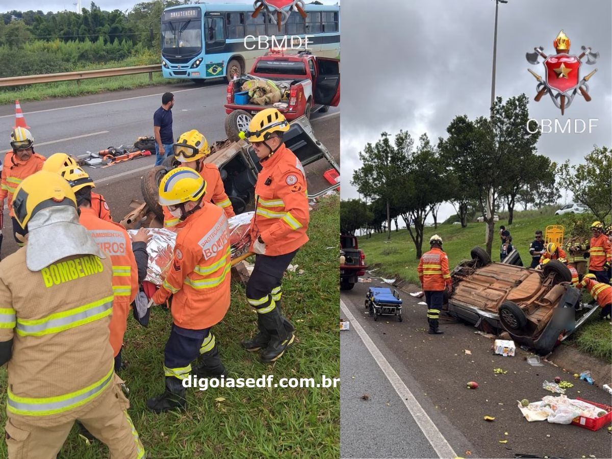 De acordo com informações do CBMDF, o chamado foi registrado por volta das 9h15. No local, os socorristas encontraram dois veículos de passeio envolvidos na colisão, ambos no acostamento esquerdo da rodovia. Um dos automóveis capotou com o impacto.