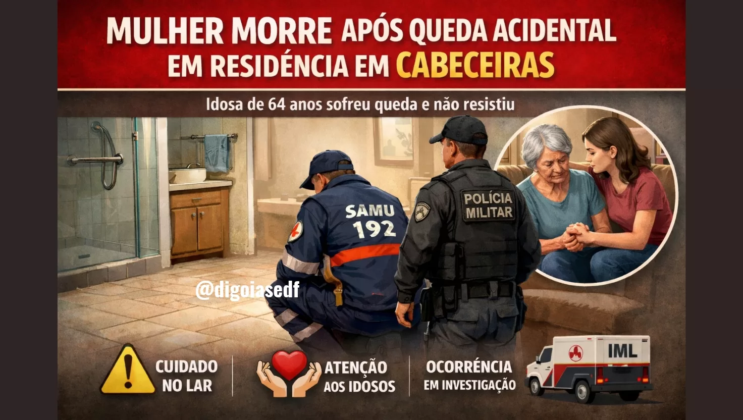 Uma mulher de 64 anos morreu na tarde desta quinta-feira após sofrer uma queda acidental dentro de sua residência, localizada no bairro Enis Machado, no município de Cabeceiras, no Entorno do Distrito Federal.