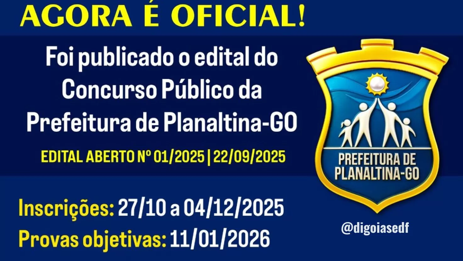 A Prefeitura de Planaltina de Goiás publicou o Edital nº 01/2025, abrindo inscrições para concurso público com vagas em diversas áreas da administração municipal. O período de inscrição será de 27 de outubro a 04 de dezembro de 2025, exclusivamente pelo site www.access.org.br. As provas objetivas estão programadas para o dia 11 de janeiro de 2026.